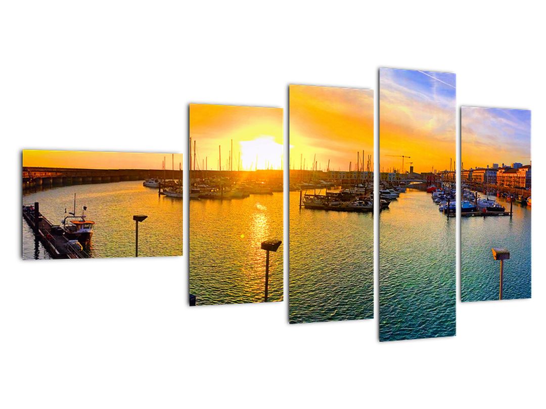 Obraz přístavu při zapadajícím slunci
